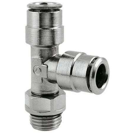 Форма фитинга: тройник T-образный с нар. резьбой угловой поворотный • Подключение: M5-5 мм • Материал корпуса: латунь никелированная