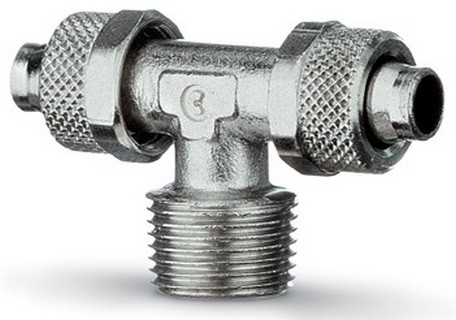 Форма фитинга: тройник T-образный с нар. резьбой осевой • Подключение: R1/8-8/6 мм • Материал корпуса: латунь никелированная