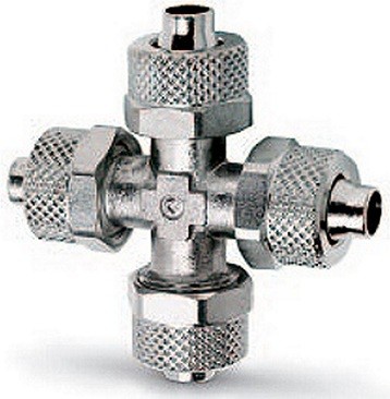 Форма фитинга: крестовина X-образная • Подключение: 6/4 мм • Материал корпуса: латунь никелированная