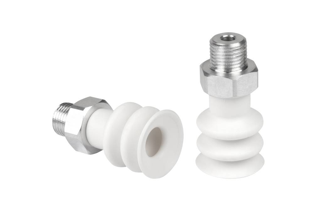 - Круглая, сильфонная присоска с 2,5 гофра для перемещения чрезвычайно чувствительных заготовок (оптимальный демпфирующий эффект)
