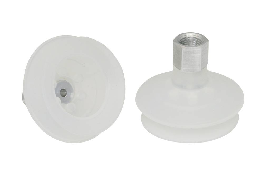 - Круглая, сильфонная присоска с 1,5 гофра для перемещения чрезвычайно чувствительных заготовок (оптимальный демпфирующий эффект благодаря гофру и гладкой уплотнительной кромке)