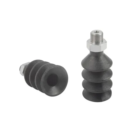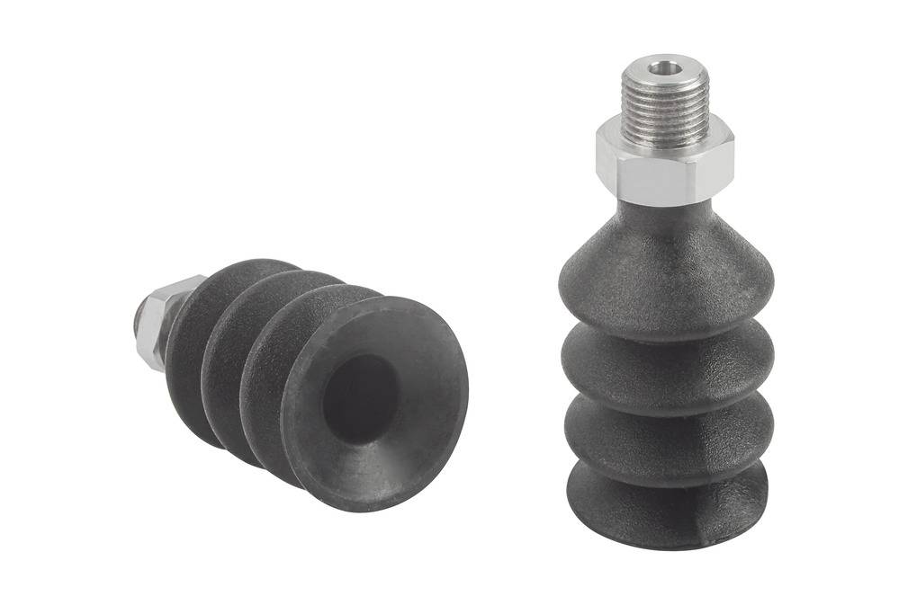 - Круглая, сильфонная присоска с 3,5 гофра для перемещения легко повреждаемых заготовок благодаря оптимальному демпфирующему эффекту, большой ход и гладкая уплотнительная кромка
