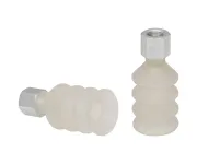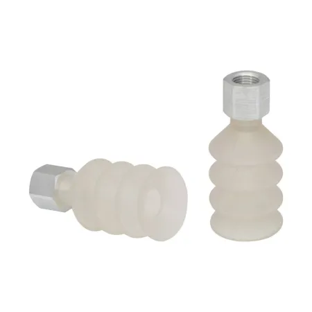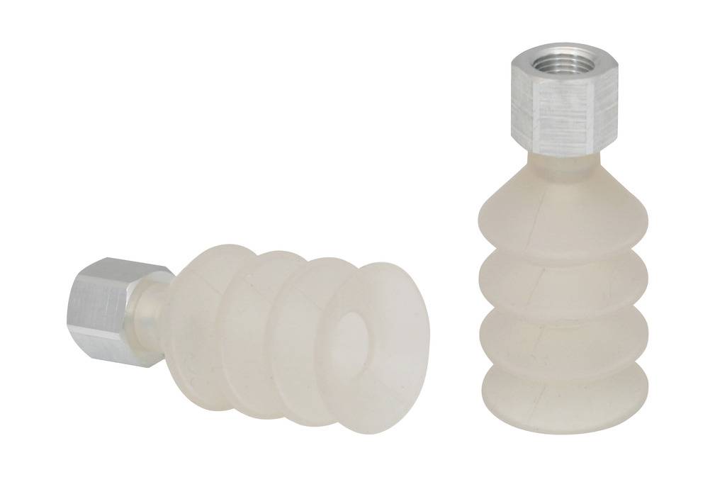- Круглая, сильфонная присоска с 3,5 гофра для перемещения легко повреждаемых заготовок благодаря оптимальному демпфирующему эффекту, большой ход и гладкая уплотнительная кромка