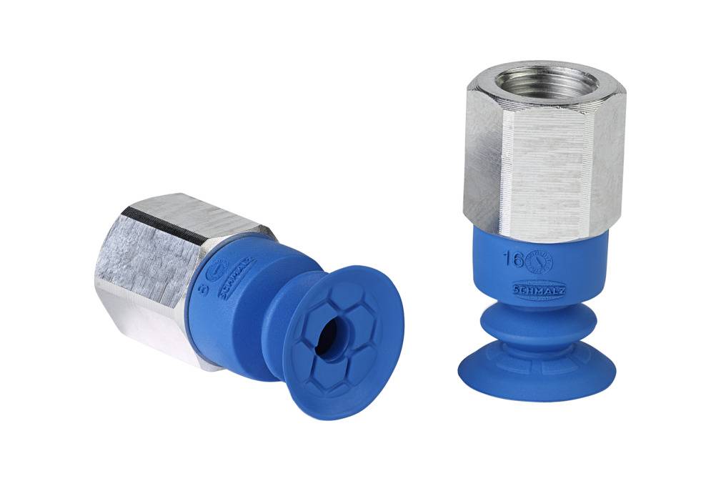 - Suction cup with thin and flexible sealing lip consisting of flat suction cup SFF (1) or bellows suction cup SFB1 with 1.5 folds (2) and Schmalz connecting element SC (3)