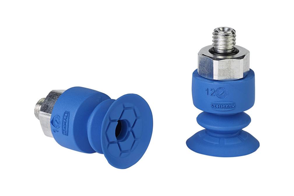 - Suction cup with thin and flexible sealing lip consisting of flat suction cup SFF (1) or bellows suction cup SFB1 with 1.5 folds (2) and Schmalz connecting element SC (3)