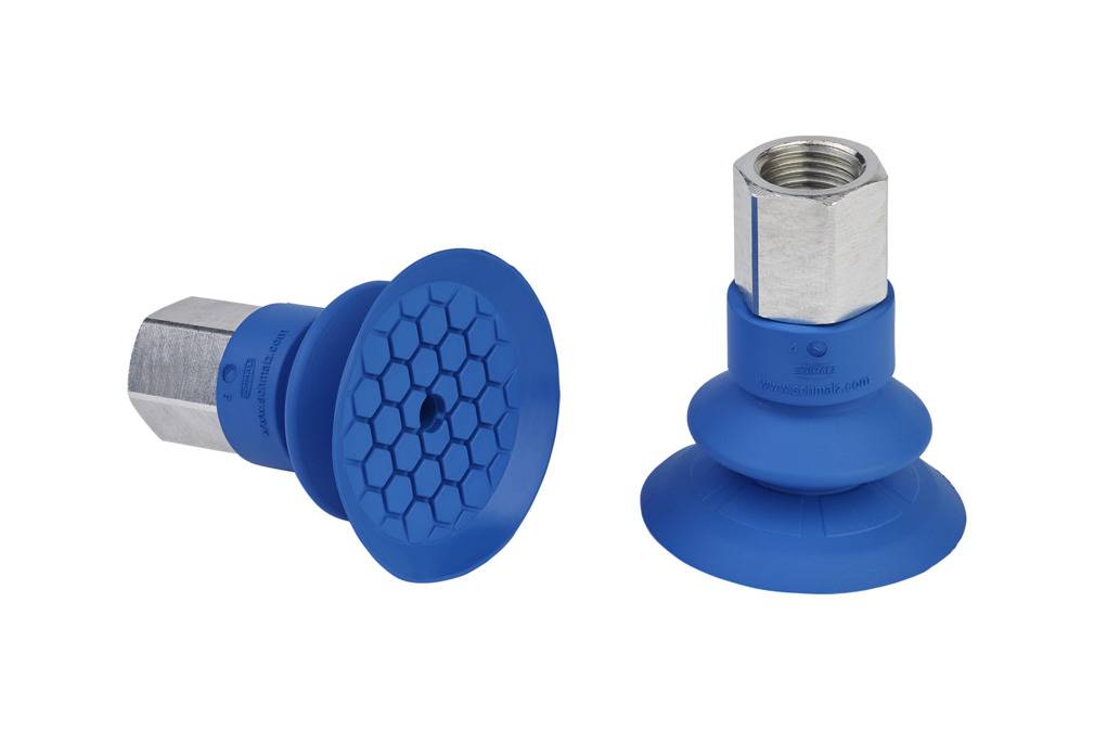 - Suction cup with thin and flexible sealing lip consisting of flat suction cup SFF (1) or bellows suction cup SFB1 with 1.5 folds (2) and Schmalz connecting element SC (3)
