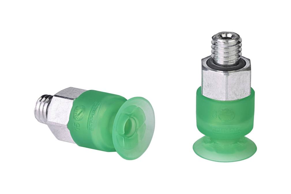 - Suction cup with thin and flexible sealing lip consisting of flat suction cup SFF (1) or bellows suction cup SFB1 with 1.5 folds (2) and Schmalz connecting element SC (3)