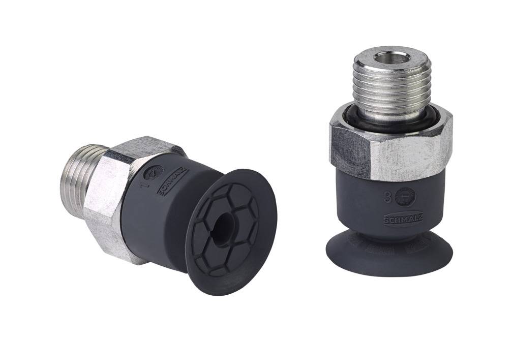 - Suction cup with thin and flexible sealing lip consisting of flat suction cup SFF (1) or bellows suction cup SFB1 with 1.5 folds (2) and Schmalz connecting element SC (3)