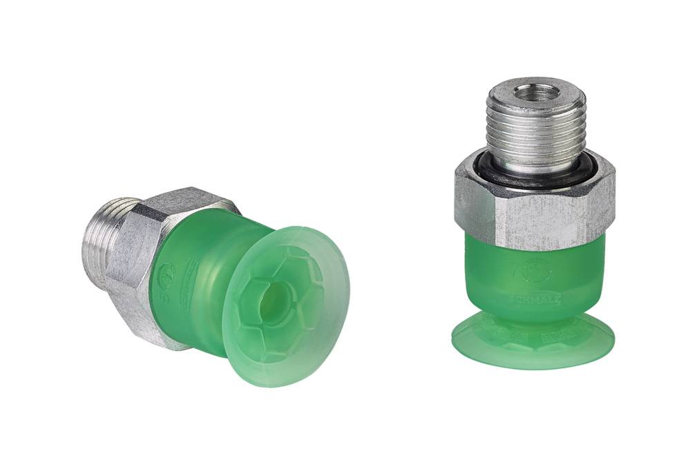 - Suction cup with thin and flexible sealing lip consisting of flat suction cup SFF (1) or bellows suction cup SFB1 with 1.5 folds (2) and Schmalz connecting element SC (3)