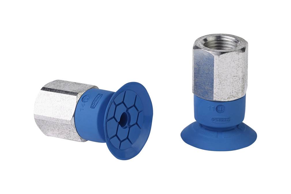 - Suction cup with thin and flexible sealing lip consisting of flat suction cup SFF (1) or bellows suction cup SFB1 with 1.5 folds (2) and Schmalz connecting element SC (3)