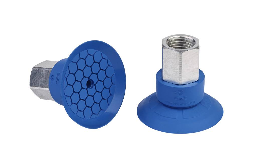 - Suction cup with thin and flexible sealing lip consisting of flat suction cup SFF (1) or bellows suction cup SFB1 with 1.5 folds (2) and Schmalz connecting element SC (3)