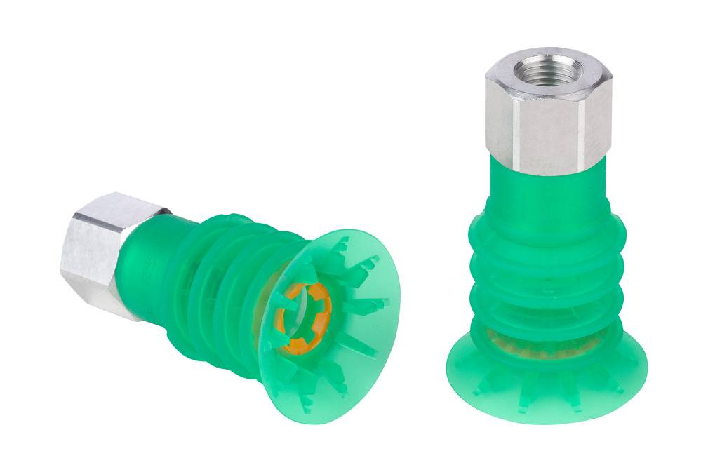 - Сильфонная присоска SPB4f с 4,5 гофра (1), а также с мягкой и гибкой уплотнительной кромкой с сегментными ребрами потока и встроенным стабилизатором мешков