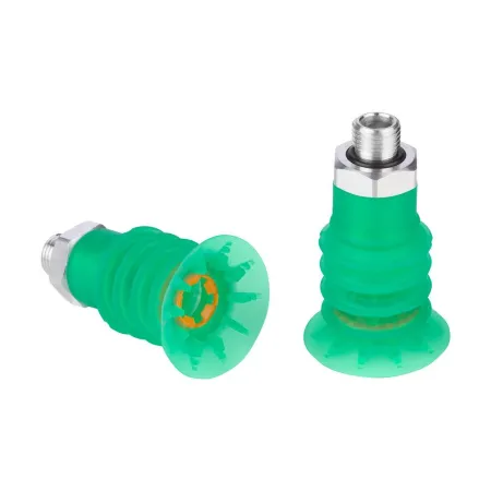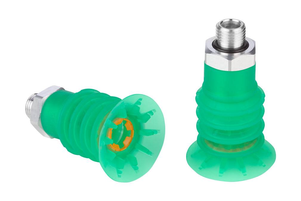 - Сильфонная присоска SPB4f с 4,5 гофра (1), а также с мягкой и гибкой уплотнительной кромкой с сегментными ребрами потока и встроенным стабилизатором мешков