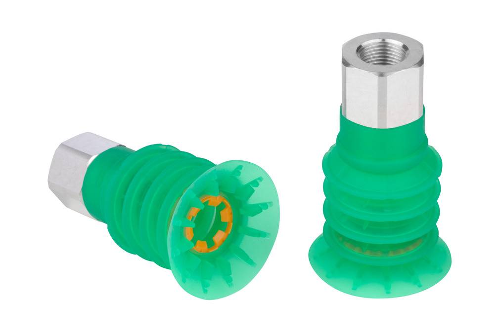 - Сильфонная присоска SPB4f с 4,5 гофра (1), а также с мягкой и гибкой уплотнительной кромкой с сегментными ребрами потока и встроенным стабилизатором мешков