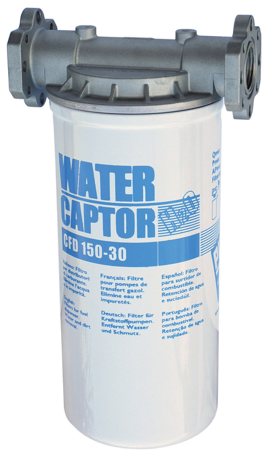 Патронные напорные водопоглощающие фильтры. Фильтр-сепаратор воды. Напорный фильтр патронного типа с поглощением воды. Данный фильтр дает гарантию защиты двигателей, получающих дизельное топливо на АЗС. Характеристикой этого типа фильтров является сепарация и поглощение воды, находящейся в нагнетаемом дизельном топливе. Поглощение воды вызывает уменьшение фильтрующей способности с постепенной потерей нагрузки. Отработанный водой фильтр подлежит замене. Эксплуатационные данные: Фильтрующая способность 30 мкм, Пропускная способность 70 - 150 л/ Мин. Рабочее давление 3.5 бар. Давление разрыва 10 бар.
