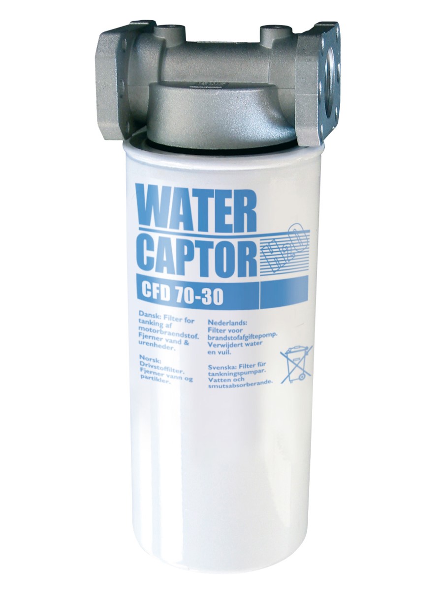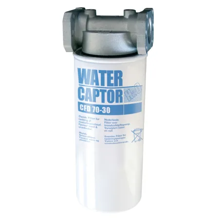 Патронные напорные водопоглощающие фильтры. Фильтр-сепаратор воды. Напорный фильтр патронного типа с поглощением воды. Данный фильтр дает гарантию защиты двигателей, получающих дизельное топливо на АЗС. Характеристикой этого типа фильтров является сепарация и поглощение воды, находящейся в нагнетаемом дизельном топливе. Поглощение воды вызывает уменьшение фильтрующей способности с постепенной потерей нагрузки. Отработанный водой фильтр подлежит замене. Эксплуатационные данные: Фильтрующая способность 30 мкм, Пропускная способность 70 - 150 л/ Мин. Рабочее давление 3.5 бар. Давление разрыва 10 бар.