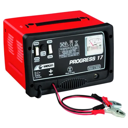 Полупрофессиональное зарядное устройство HELVI Progress 17 для зарядки автомобильных и других аккумуляторных батарей емкостью от 20 а • ч до 100 а • ч со стандартным рабочим напряжением 12 V и 24 V. Компактные размеры (200 x 260 x 175), незначительный вес (5 кг), работа от сети 220 V и максимальный ток зарядки 12,5 A делают устройство оптимальным выбором для автомастерских, автопарков, строительных и сельскохозяйственных фирм, предприятий, где эксплуатируется неавтомобильная техника с питанием от аккумуляторов. Прибор укомплектован медными кабелями с зажимами типа прищепка. Корпус HELVI Progress 17 выполнен из металла, покрытого порошковой краской. В верхней части имеется обрезиненная ручка (исключающая случайные удары током) для удобного захвата и переноски устройства. На лицевой части прибора находится панель управления с омметром для визуального контроля, регулятором тока, переключателем напряжения, контактами для подключения зарядного кабеля.